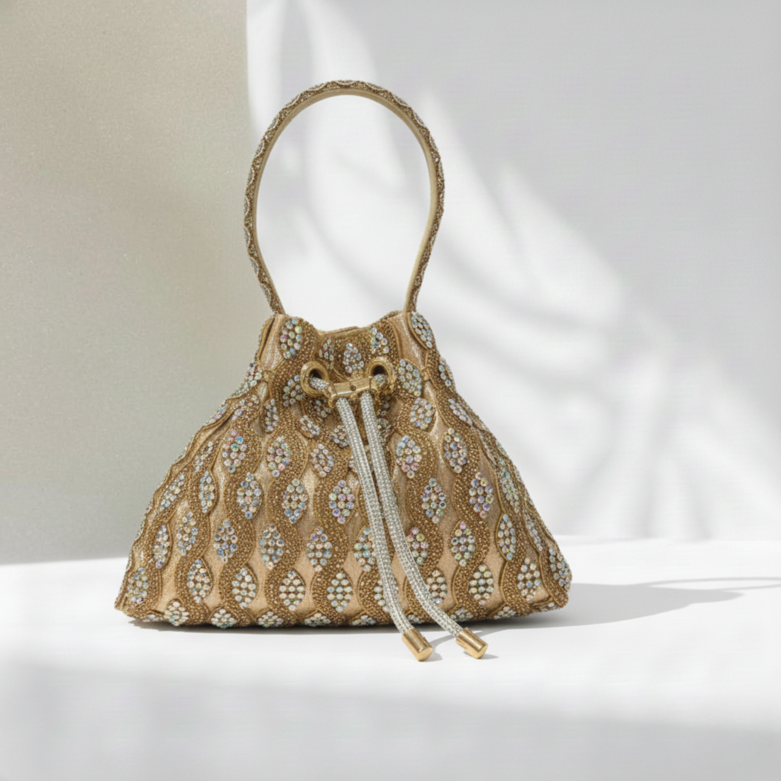 Carry elegance wherever you go with the Peach Glow Crystal Pouch. Its soft peach hue with sparkling crystals makes it perfect for any occasion.