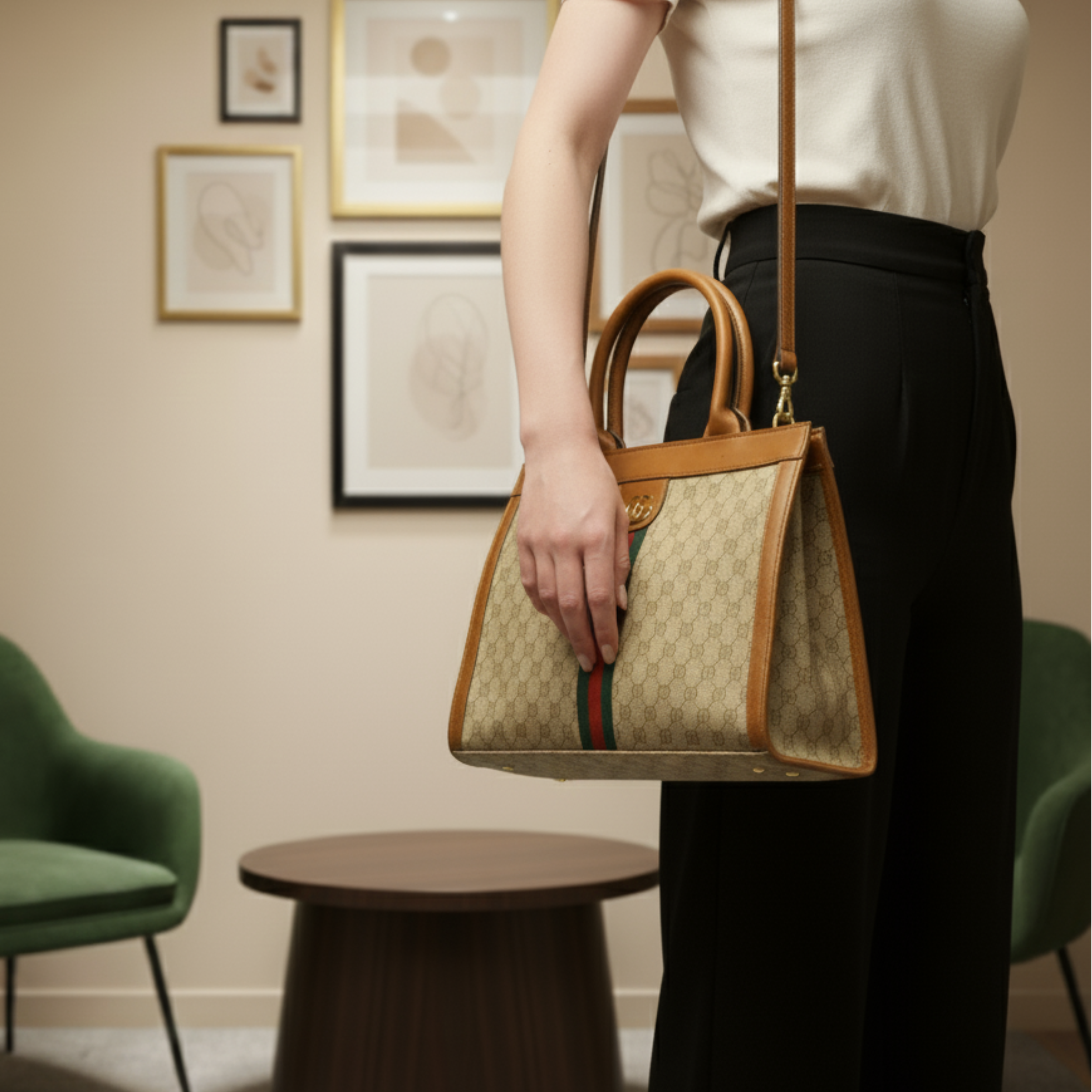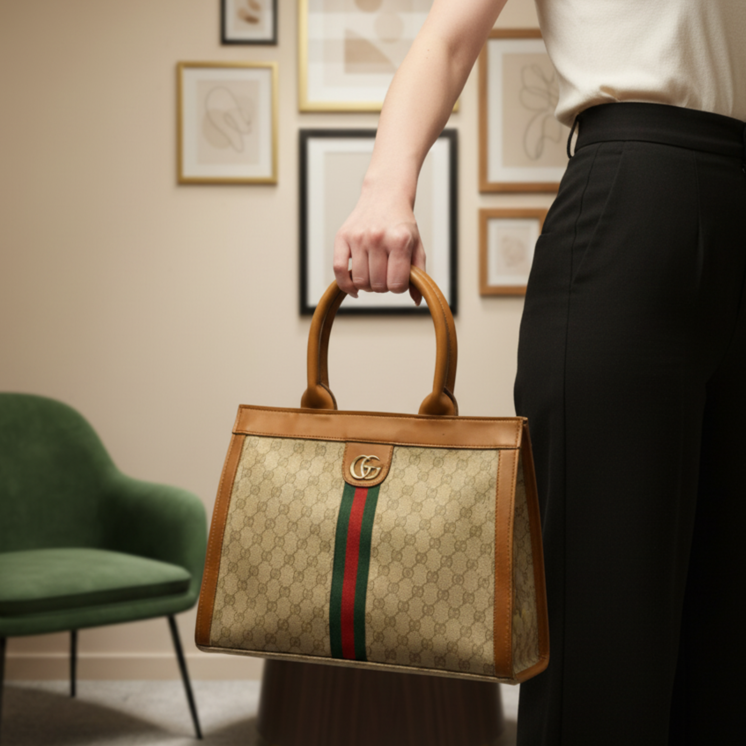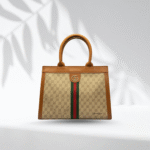 Add timeless charm to your collection with this brown designer-inspired canvas shoulder bag. Crafted from durable rexine, it combines a classic canvas print with rich brown trim and sturdy shoulder straps for a polished finish. The design is enhanced with a striking central red and green stripe and a bold gold-tone front logo, offering both elegance and sophistication. Spacious and practical, this shoulder bag is perfect for work, shopping, or everyday wear — a versatile accessory that balances luxury and utility.