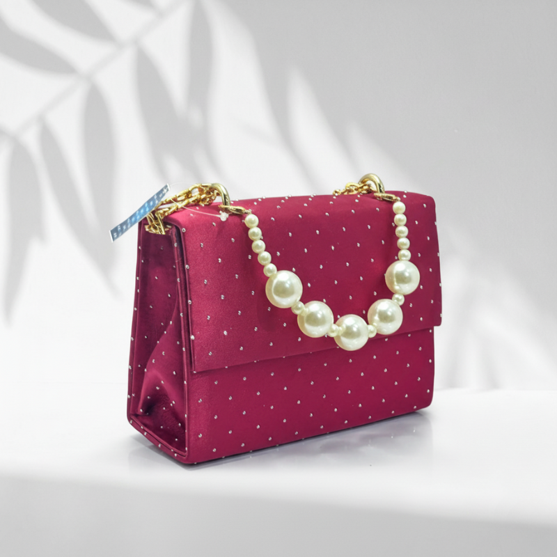 A royal pink luxury handbag with delicate pearl accents and a gold chain strap — perfect for soft, stylish, and feminine looks.