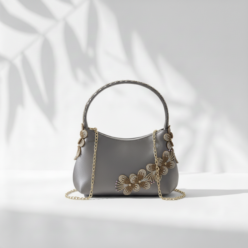 Step into modern glamour with the Flora Luxe – Silver Mist handbag. Sleek, stylish, and effortlessly chic — a perfect blend of fashion and luxury.