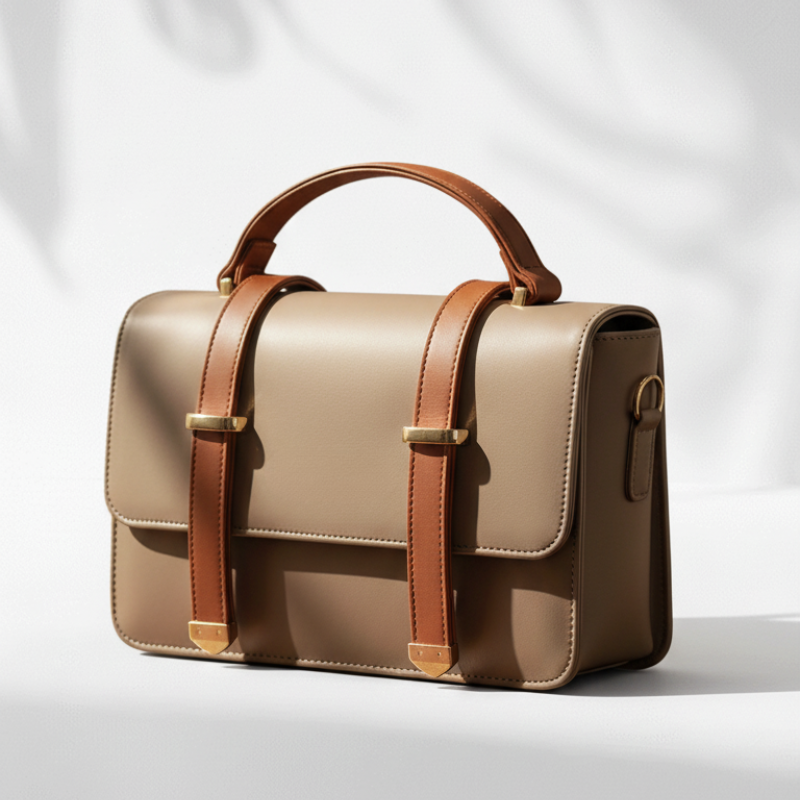 Made with exquisite craftsmanship, this handbag features smooth taupe beige leather, polished brown straps, and refined golden detailing. Its structured silhouette offers both style and functionality, making it the perfect choice for office days, casual outings, or special evenings.